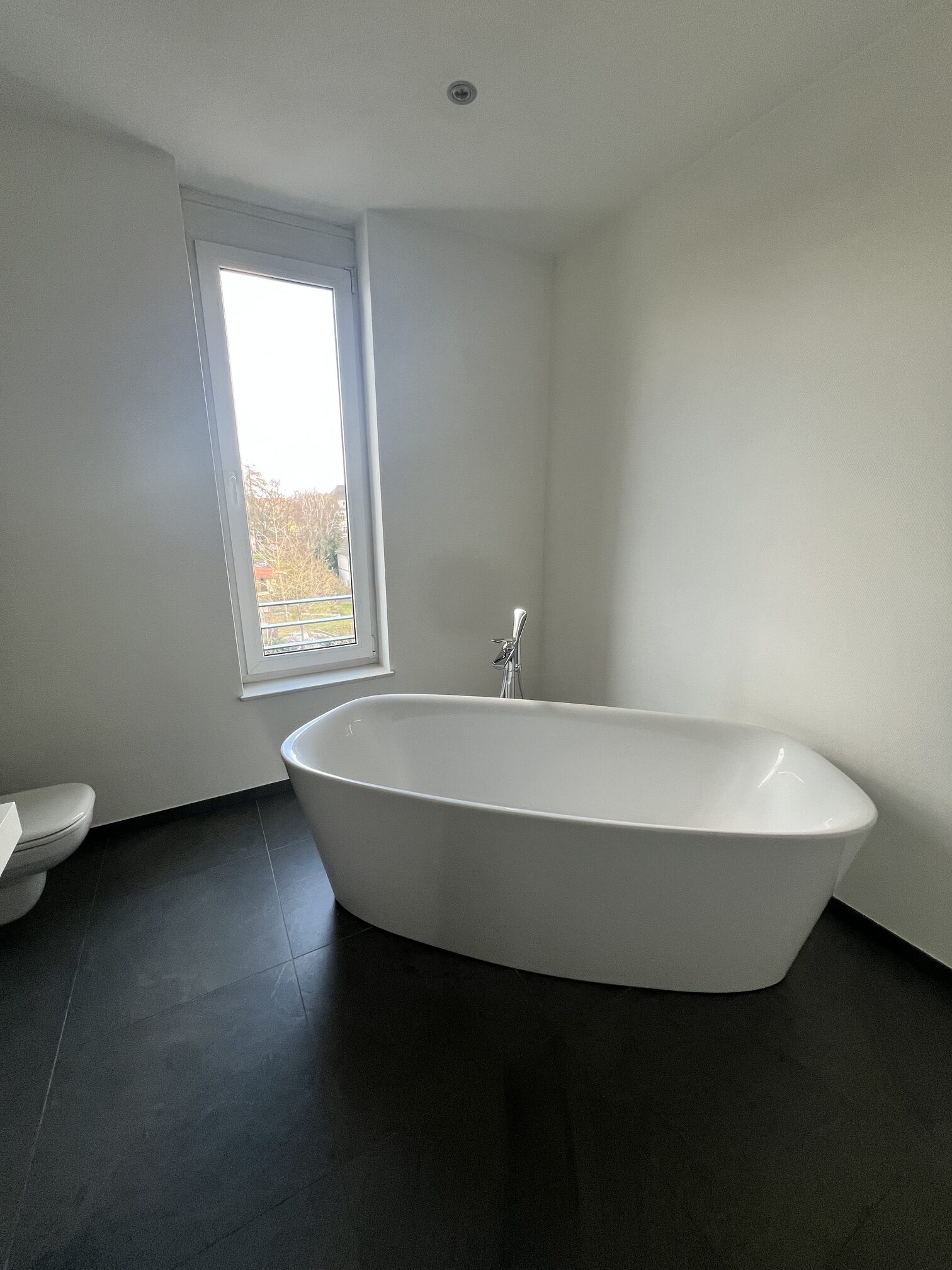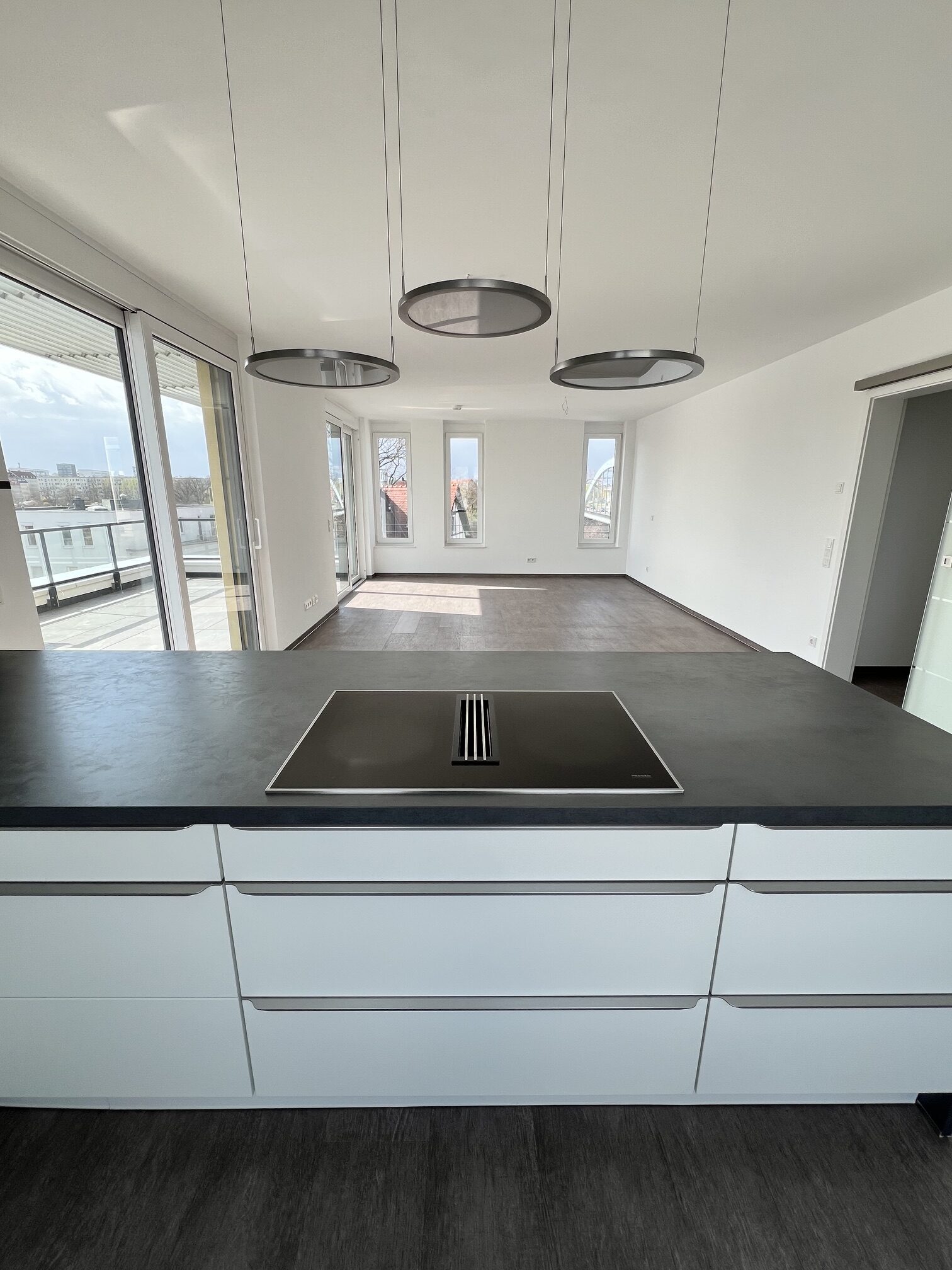 Die architektonische Formsprache des exklusiven Wohnhauses garantiert ein exklusives Wohnen. Die Wohnungsgröße beträgt 146,46 m² und befindet sich im 4.Obergeschoss. Die Wohnung verfügt über eine komfortable Raumhöhe von 2,63 m. Im Erdgeschoss sind neben den Technikräumen, der Wohnungskeller und 2 große PKW-Garagenstellplätze untergebracht. Die Wohnung verfügt weiter über eine sehr hochwertige und luxuriöse Ausstattung. Die Ausstattungsdetails sind: Fahrstuhl, hochwertiger PVC-Designbelag, Fußbodenheizung, Master-Bad mit Fenster, elektrische Außen-Sonnenschutzrollos an allen Fenstern, Hauswirtschaftsraum mit Waschmaschinenanschluss, großzügiger Entreebereich im Flur, begehbarer Kleiderschrank im Schlafzimmer etc. Weiterhin ist eine hochwertige Einbauküche inklusive Markengeräten von Miele eingebaut, wie Backofen, Kühlschrank, Tiefkühlschrank, Induktionsfeld inklusive Abluft etc. Dies garantiert ein gehobenes Wohnen.